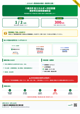 物価高騰等の影響下にある市内事業者の皆様の、省エネルギー化に資する設備投資等を支援し、エネルギー費用負担の軽減と事業継続の安定化を図るため、「八幡浜市 省エネルギー対応設備更新等支援事業補助金」の公募を令和8年4月1日から開始します。