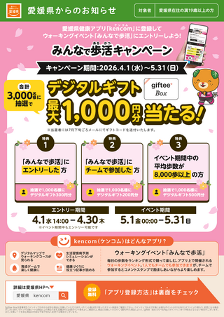 ※アプリの登録方法やイベントの詳細は、愛媛県のHP【愛媛県 kencom】をご確認ください。